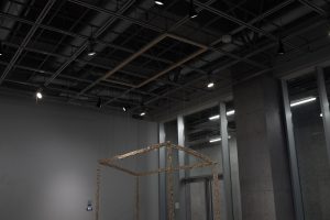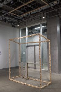The structure sways gently as viewers move through it. Reflective road markings obtained from Tokyo sidewalks hang from a laundry pole, acting as subtle spatial cues; visual prompts to navigate the narrow, fragile space. A video documenting the stage’s transformation through the wood-chipper was exhibited alongside the sculpture. A photograph of the original stage was also shown, framing the installation within a cycle of material transformation. a view traces the movement of material and self, and how sculptural forms could be conditioned by shifting geographies, scales, and contexts of living.