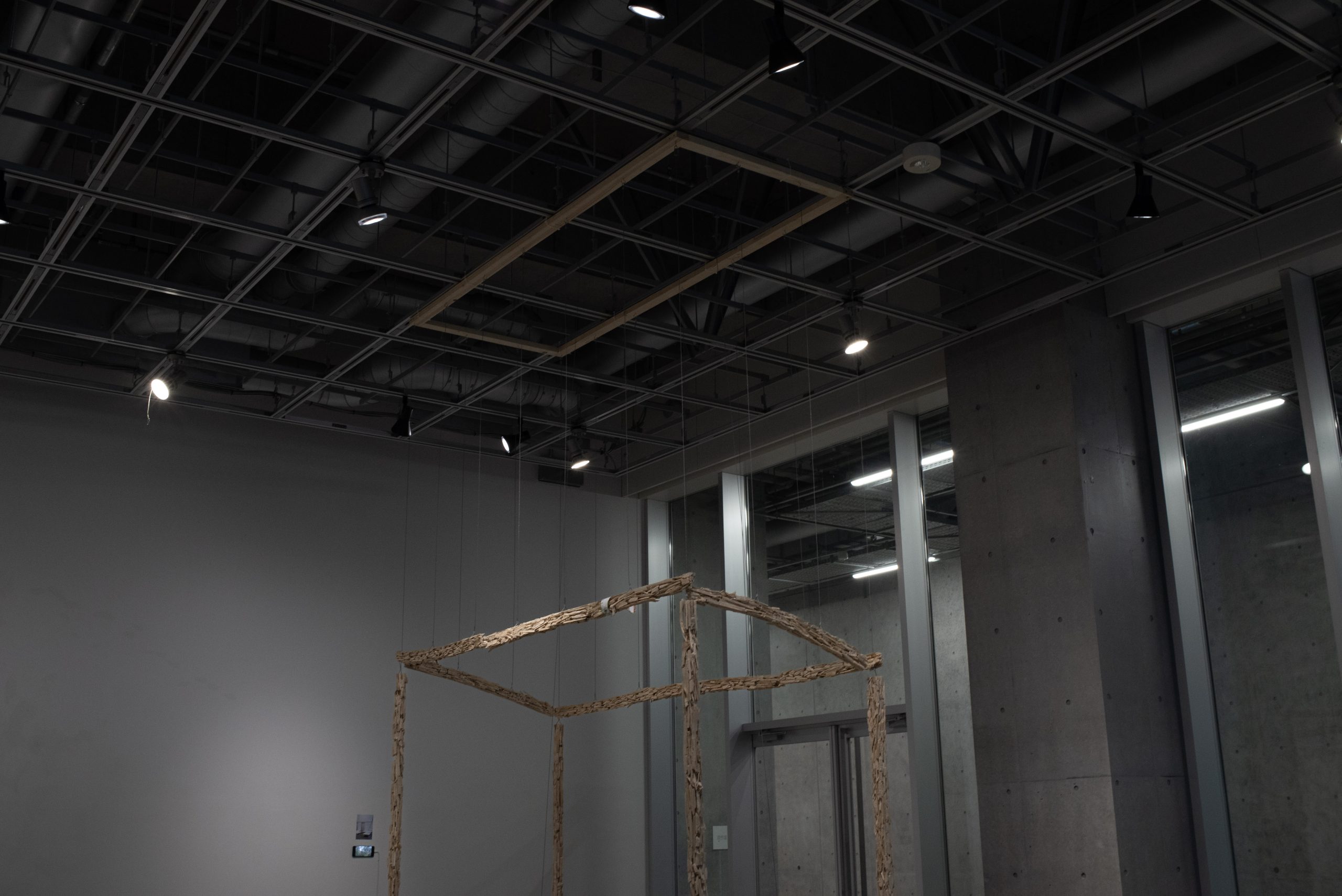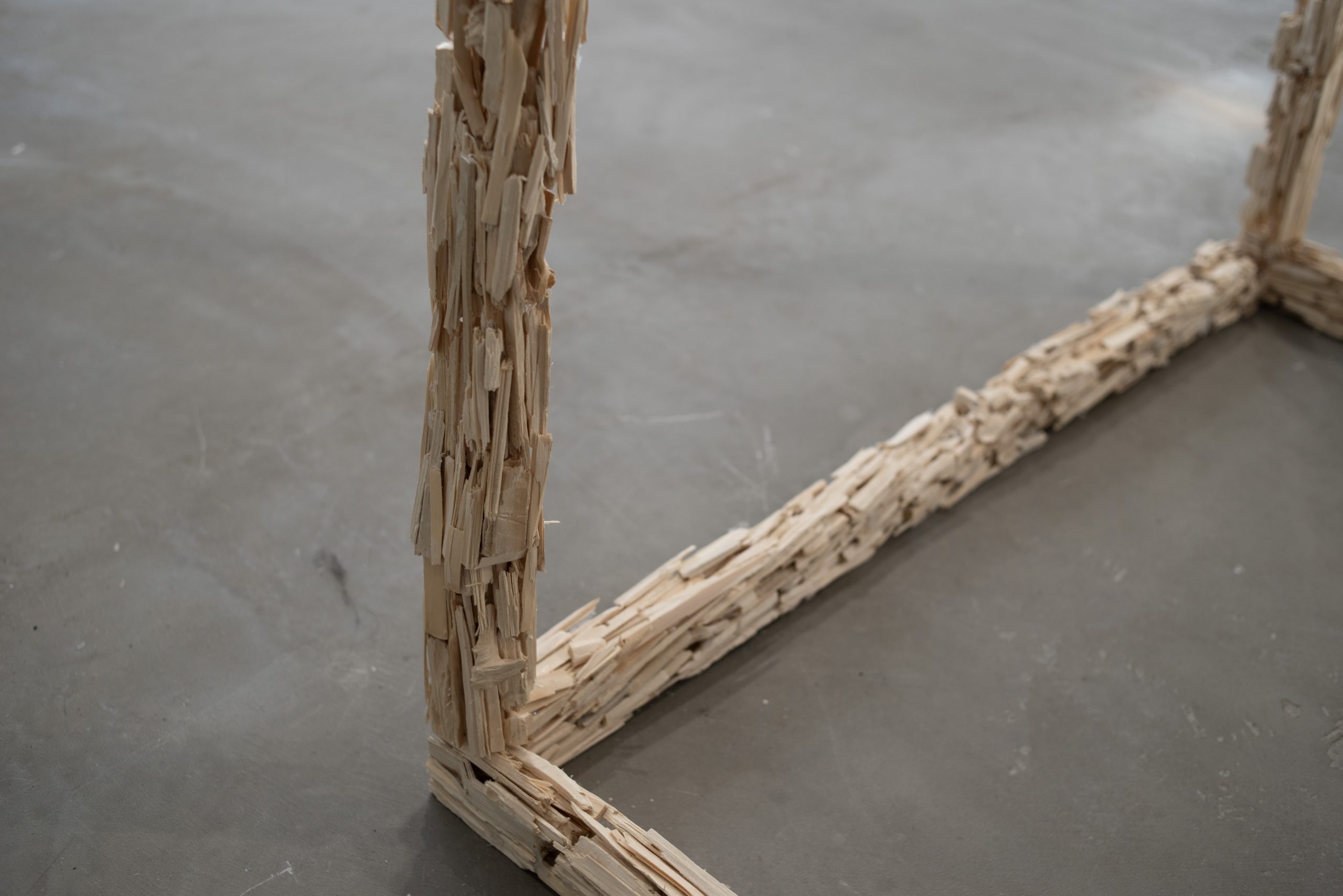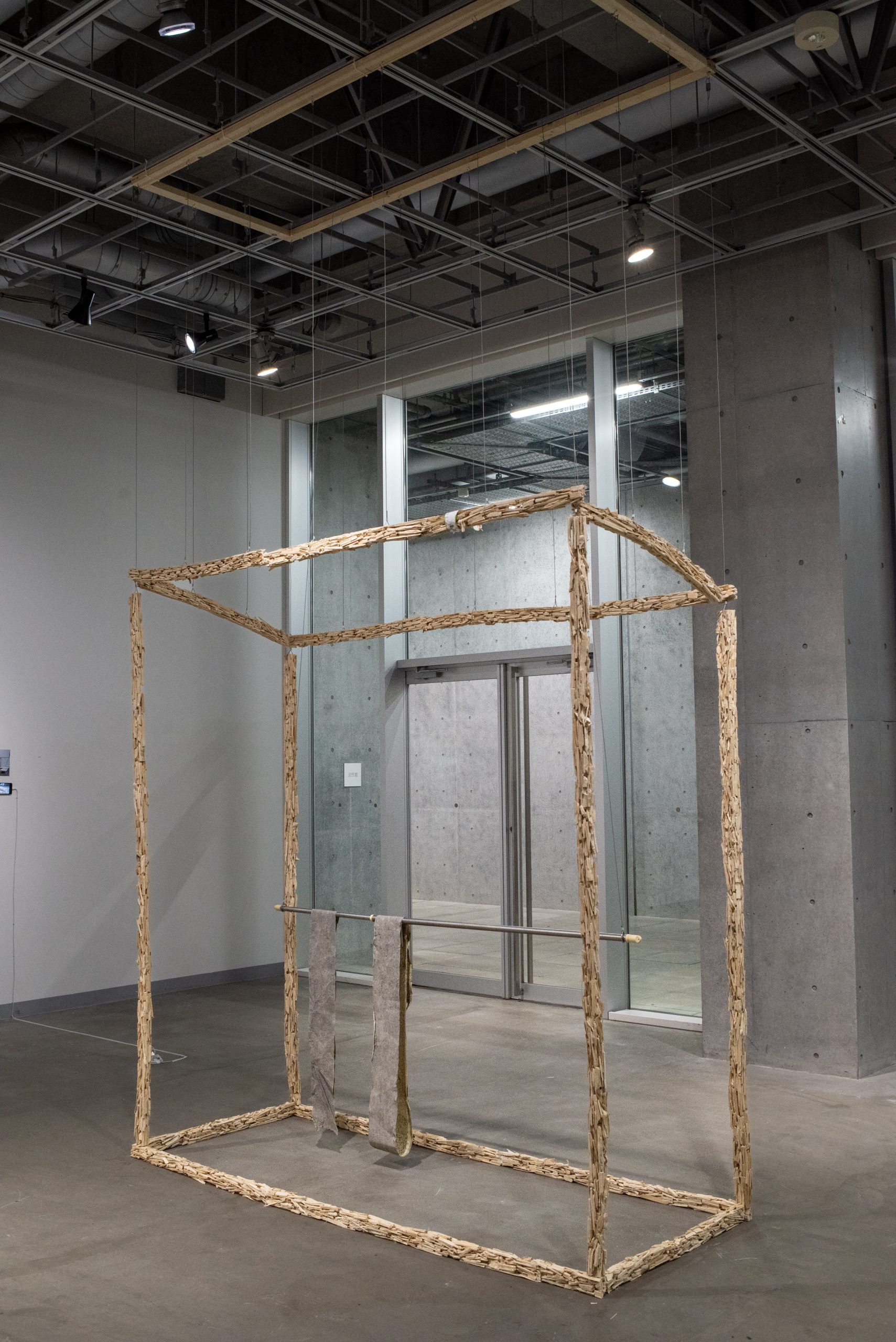 The resulting wood-chips were packed into a single suitcase, limited to 24kg, the maximum checked baggage allowance for international travel. My second suitcase contained only personal belongings. After arriving in Tokyo, I reconstructed the material on the balcony of my temporary accommodation. Over two months, I pieced the fragments back together, forming meter-long sections like a puzzle. These sections were then transported to the exhibition site, where they were combined and suspended from a network of steel wires. The final reconstruction was made to accurately reflect the dimensions of the balcony where the labor of reassembly took place, working within this space as the final dimensional constraint (243 x 95 x 239 cm).