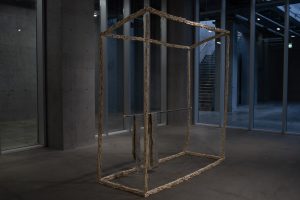 2024. Spruce timber, wood glue, steel wire, steel hoops, laundry pole, road-markings, luggage-tag. 243 x 95 x 239 cm