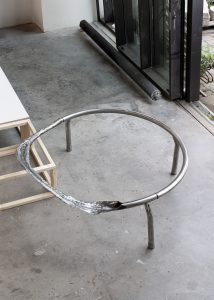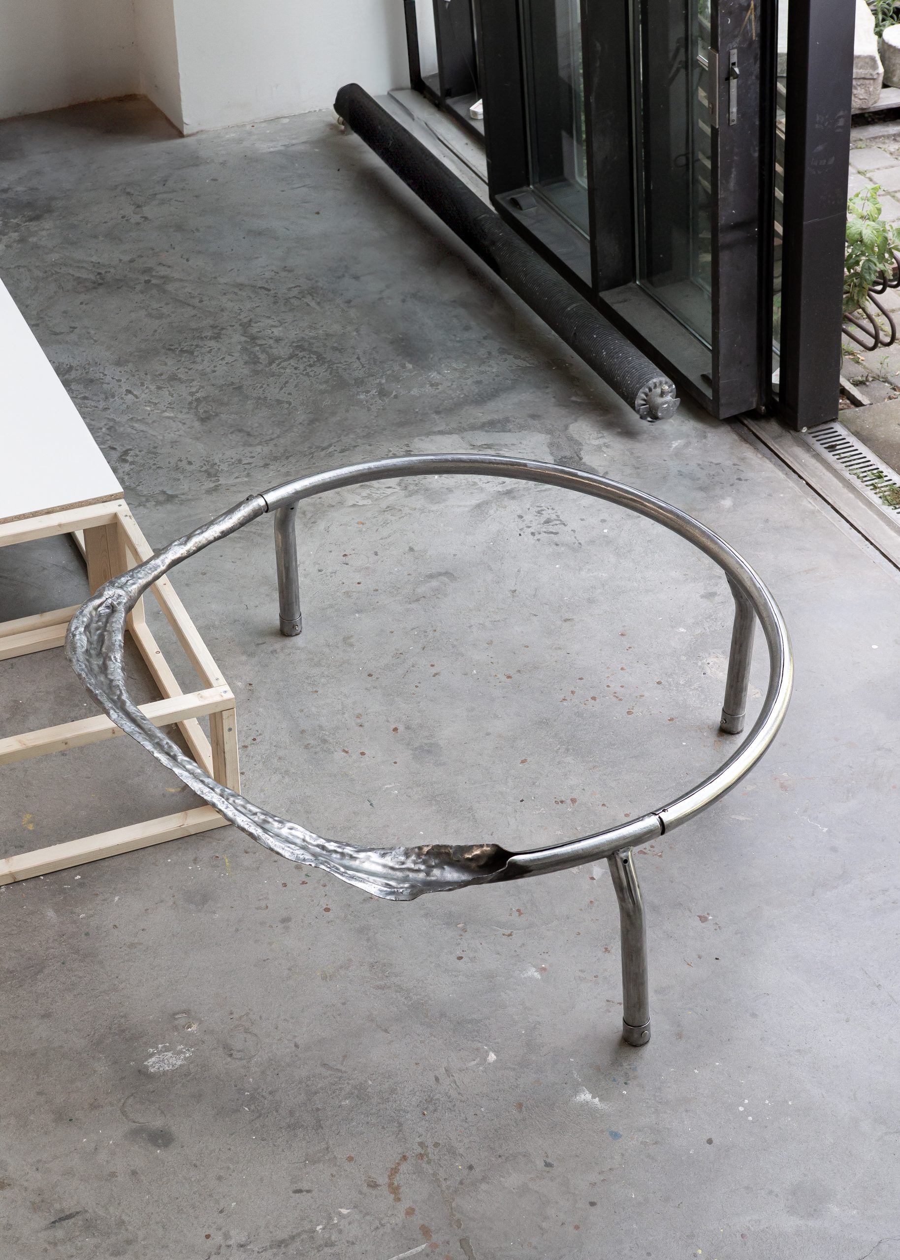 Container (2024) was initially intended as a site-specific sculpture. It is composed of a circular steel barricade, an assisted readymade based on a form commonly found on pavements across Berlin. Preserving its original material and scale, one half of the steel structure has been flayed and partially inverted. This new surface is marked by irregularity and directional texture, undermining the impression of an unyielding, fixed state embodied by the barricade’s vernacular form.