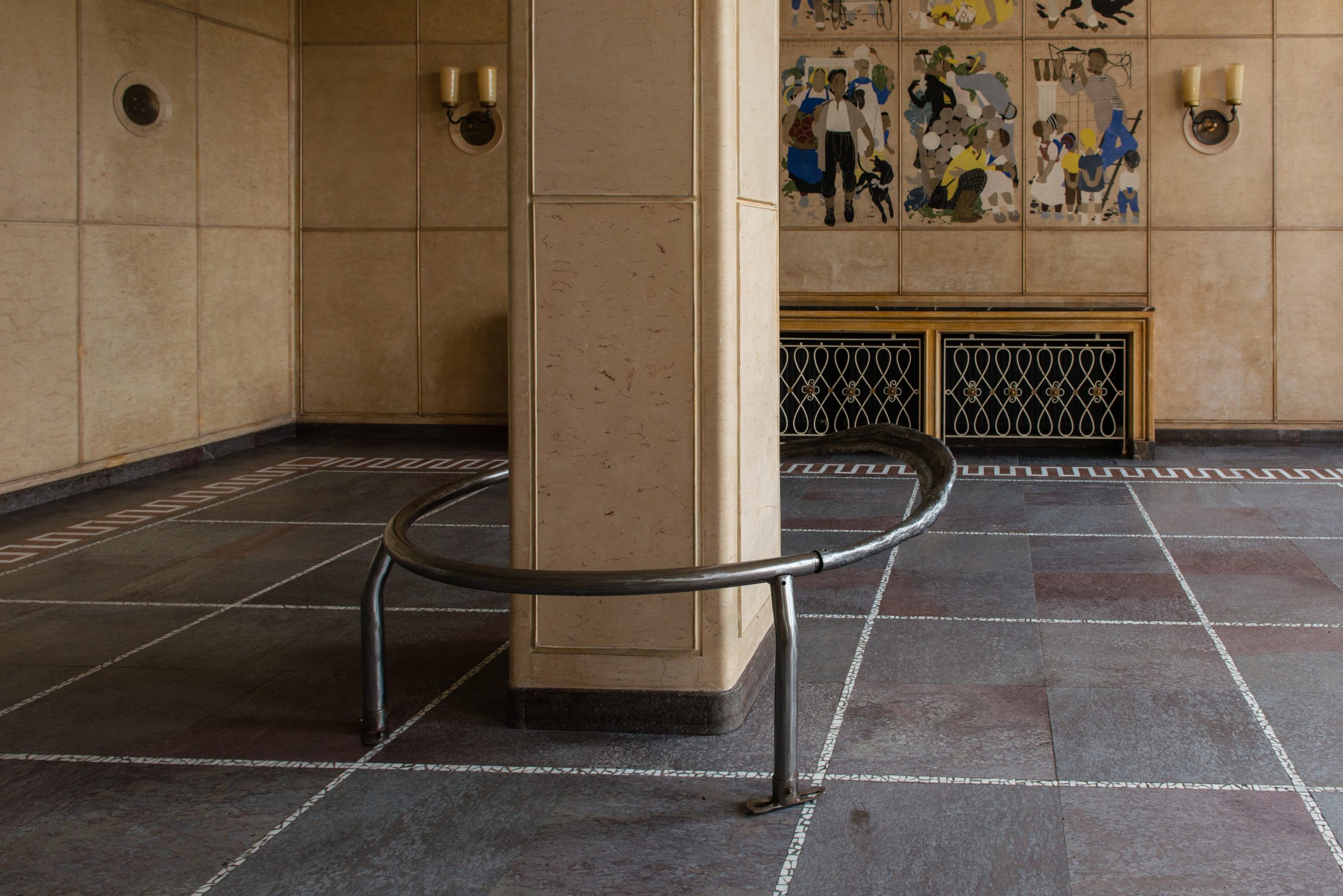 Installed in the foyer of a Hermann Henselmann tower, an architectural emblem of GDR-era socialist classicism and its projected optimism, the work engages with Ornament and Crime. This was the exhibition’s title and a reference to Adolf Loos’s 1908 essay, in which he denounced ornament as decadence and violence. Yet Loos’s own buildings, such as the Looshaus in Vienna, often relied on illusion; columns made to appear as solid marble were in fact hollow.