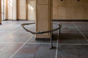 Both the barricade and the structural pillar it engulfs are circumambulatory by nature. Yet in encircling the pillar, the sculpture reverses the logic of the barrier; it gestures not toward exclusion, but toward protection. The breach and inversion open a symbolic passage. This invites a consideration of the tensions between containment and access, surface and structure, and the inherent instability of supposedly fixed architectural forms.