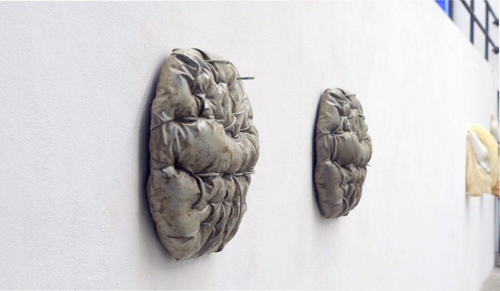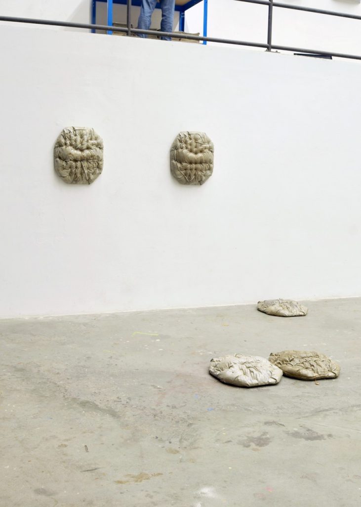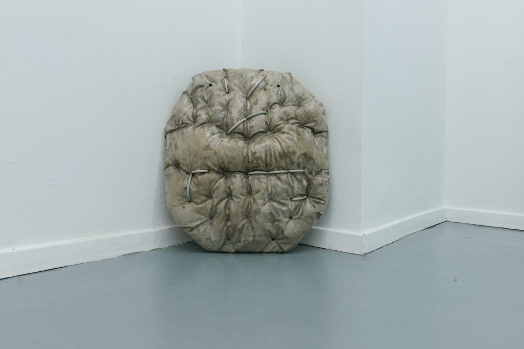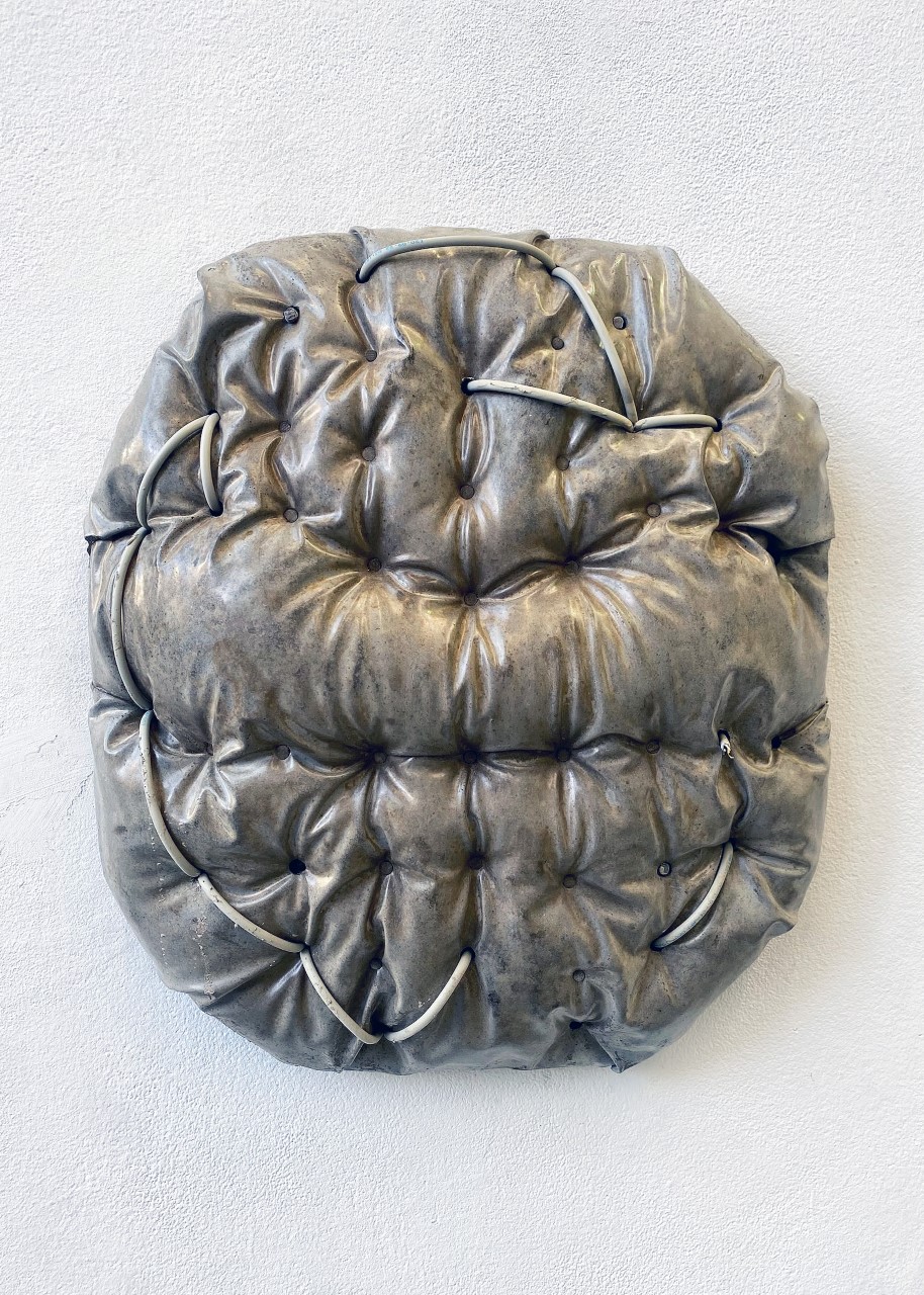 rapid loading (2022) is a series of concrete sculptures that reference the form of a cushion. Here, the pattern of upholstering is transposed into concrete: impressions of padded furniture are cast as dense, weight-bearing forms. By combining the casted form with elements that would typically remain concealed within a building, what is hidden as support becomes exposed as surface.